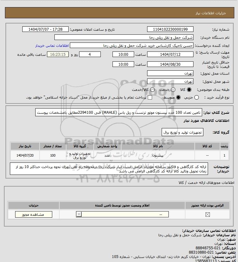 شرح کلی نیاز: تامین تعداد 100 عدد پیستون موتور ترنست و ریل باس (MAHLE) فنی 2294100مطابق بامشخصات پیوست