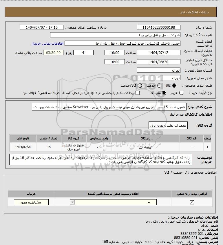 استعلام بها و موضوع استعلام استعلام تامین تعداد 15 عدد کارتریج توربوشارژر موتور ترنست و ریل باس برند Schwitzer مطابق بامشخصات پیوست به اطلاع کلیه شرکتها و افراد متخصص واجد شرایط میرساند، آگهی گذار در نظر دارد از طریق استعلام بها، نسبت به انتخاب و دریافت پیشنهادات اقدام نماید. این استعلام با کد آگهی ثبت شده در سامانه خبرگزاری پارس نماد : 9620542 منتشر شده است. مشخصات استعلام : تاریخ شروع استعلام: 1404/07/07 آخرین مهلت ارسال پیشنهاد قیمت : 1404/07/12 و محل اجرای پروژه : استان تهران میباشد. استعلام قیمت مورد درخواست : استعلام تامین تعداد 15 عدد کارتریج توربوشارژر موتور ترنست و ریل باس برند Schwitzer مطابق بامشخصات پیوست با دستهبندیهای تخصصی و گروه های مرتبط : راه آهن, کمپرسورهای هوا, بوژی واگن, تجهیزات برق و الکترونیک, استعلام اطلاع رسانی میگردد.