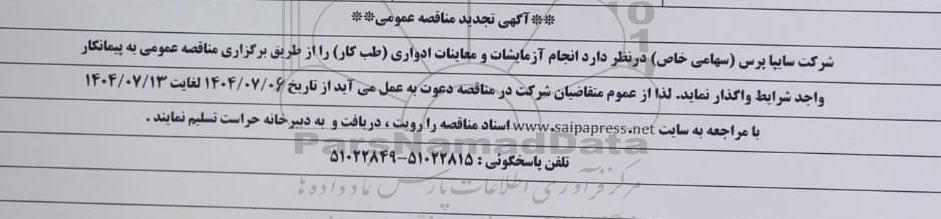 شرکت سایپا پرس (سهامی خاص) در نظر دارد انجام آزمایشات و معاینات ادواری (طب کار) را از طریق برگزاری مناقصه عمومی به پیمانکار واجد شرایط واگذار نماید. لذا از عموم متقاضیان شرکت در مناقصه دعوت بعمل می آید از تاریخ 1404.07.06 لغایت 1404.07.13 با مراجعه به سایت www.saipapress.net اسناد مناقصه را رویت، دریافت و به دبیرخانه حراست تسلیم نمایند.