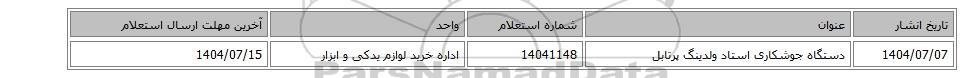 | 1404/07/07 | دستگاه جوشکاری استاد ولدینگ پرتابل | 14041148 | اداره خرید لوازم یدکی و ابزار | 1404/07/15 |