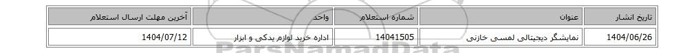 | 1404/06/26 | نمایشگر دیجیتالی لمسی خازنی | 14041505 | اداره خرید لوازم یدکی و ابزار | 1404/07/12 |
