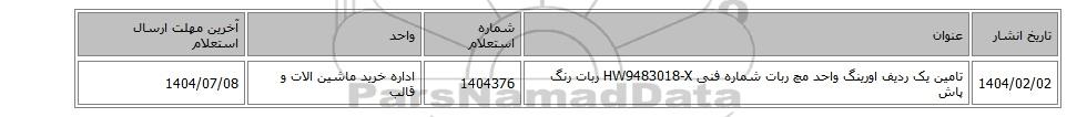 1404/02/02تامین یک ردیف اورینگ ‎واحد مچ ربات‏ شماره فنی ‎HW9483018-X ربات رنگ پاش1404376اداره خرید ماشین الات و قالب1404/07/08