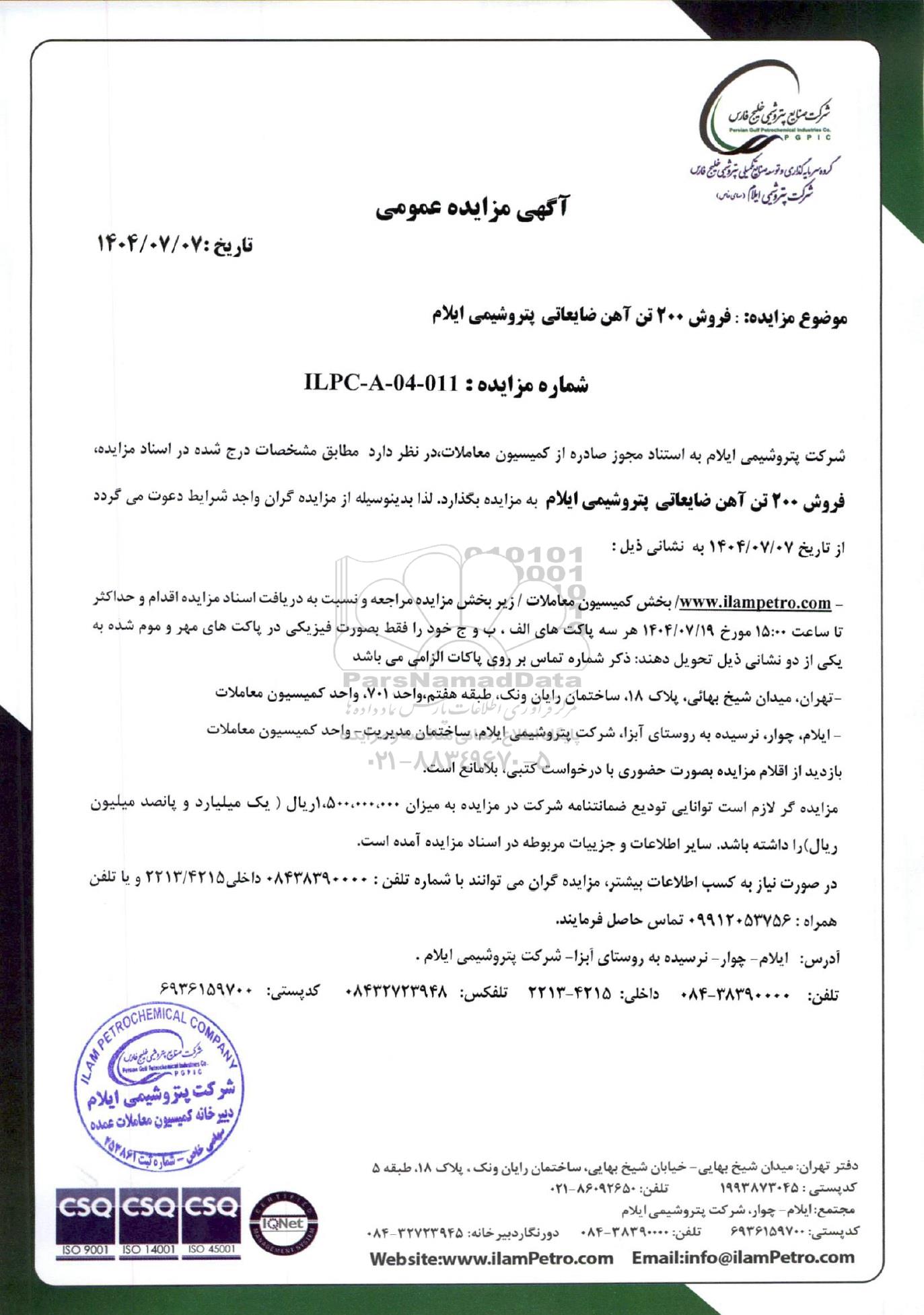 شرکت پتروشیمی ایلام به استناد مجوز صادره از کمیسیون معاملات، در نظر دارد مطابق مشخصات درج شده در اسناد مزایده، فروش 200 تن آهن ضایعاتی پتروشیمی ایلام به مزایده بگذارد. لذا بدینوسیله از مزایده گران واجد شرایط دعوت می گردد از تاریخ 1404.07.07 به نشانی ذیل: