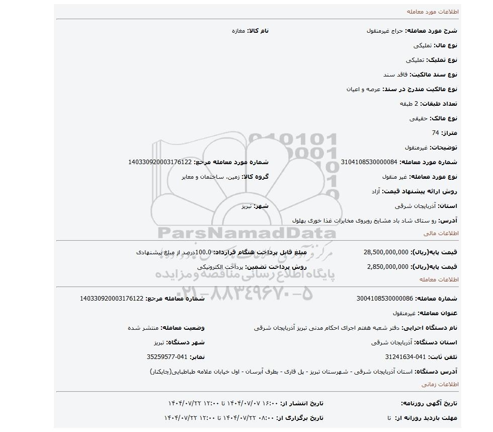 14 مزایده ششدانگ یک قطعه آپارتمان مسکونی نوع ملک طلق پلاک ثبتی 186 فرعی از 5792 اصلی 9808347 1404/08/14 new not special not payed آذربایجان شرقی