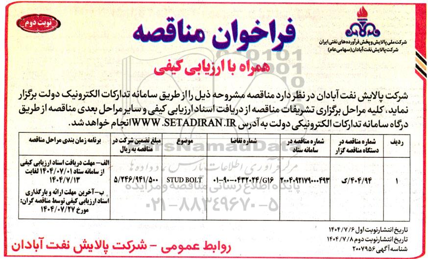 فراخوان مناقصه STUD BOLT - نوبت دوم از کلیه افراد متخصص و شرکتها واجد شرایط دعوت به عمل میآید در مناقصه با کد خبرگزاری پارس نماد: 9621579 شرکت نمایند.