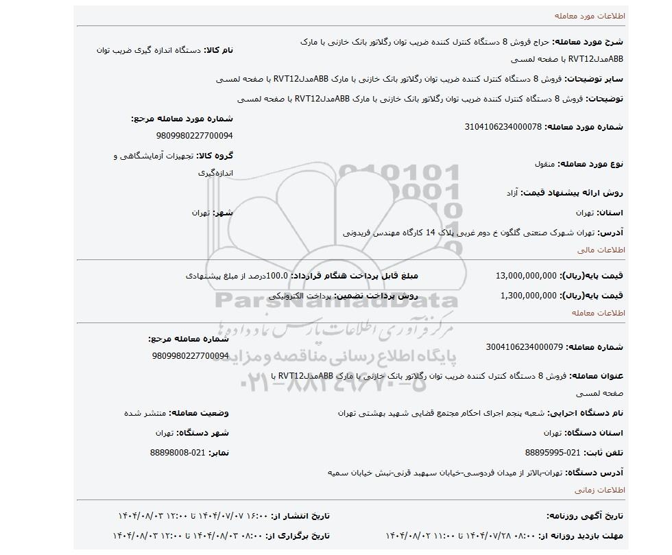 مزایده عمومی مزایده فروش 8 دستگاه کنترل کننده ضریب توان رگلاتور بانک خازنی با مارک ABBمدلRVT12 با صفحه لمسی برگزار میگردد. از کلیه افراد متخصص و شرکت‌های واجد شرایط دعوت به عمل می‌آید تا در این مزایده با کد خبرگزاری پارس نماد : 9621587 شرکت نمایند تاریخ شروع مزایده : 1404/07/07 مهلت شرکت در مزایده: تا پایان روز 1404/08/03 مکان برگزاری اموال واگذاری استان‌های تهران و دسته‌بندی‌های مربوط به این حراجی برق میباشد.