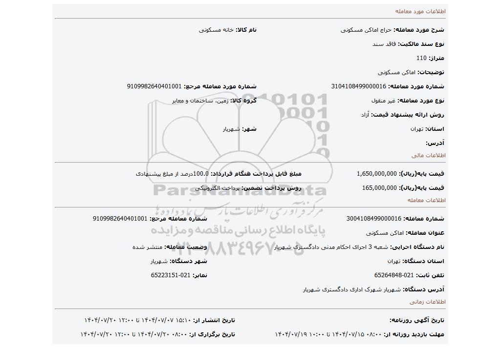 | نام دستگاه اجرایی: شعبه 3 اجرای احکام مدنی دادگستری شهریار | وضعیت معامله: منتشر شده | |