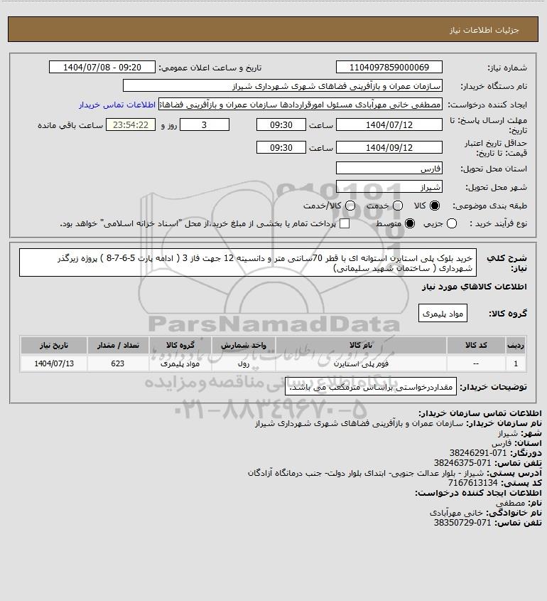 شرح کلی نیاز: خرید بلوک پلی استایرن استوانه ای با قطر 70سانتی متر و دانسیته 12 جهت فاز 3 ( ادامه پارت 5-6-7-8 ) پروژه زیرگذر شهرداری ( ساختمان شهید سلیمانی)