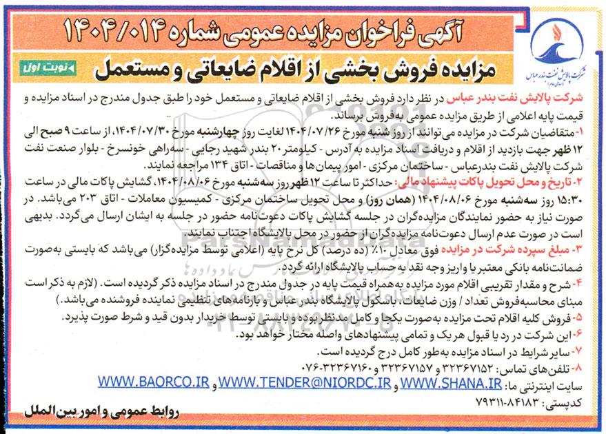 شرکت پالایش نفت بندر عباس در نظر دارد فروش بخشی از اقلام ضایعاتی و مستعمل خود را طبق جدول مندرج در اسناد مزایده و قیمت پایه اعلامی از طریق مزایده عمومی به فروش برساند.