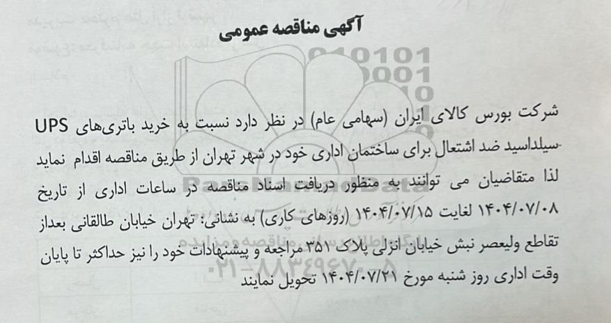 شرکت بورس کالای ایران (سهامی عام) در نظر دارد نسبت به خرید باتری های UPS سیلد اسید ضد اشتعال برای ساختمان اداری خود در شهر تهران از طریق مناقصه اقدام نماید. لذا متقاضیان می توانند به منظور دریافت اسناد مناقصه در ساعات اداری از تاریخ 1404.07.08 لغایت 1404.07.15 (روزهای کاری) به نشانی: تهران خیابان طالقانی بعد از تقاطع ولیعصر نبش خیابان انزلی پلاک 351 مراجعه و پیشنهادات خود را نیز حداکثر تا پایان وقت اداری روز شنبه مورخ 1404.07.21 تحویل نمایند.