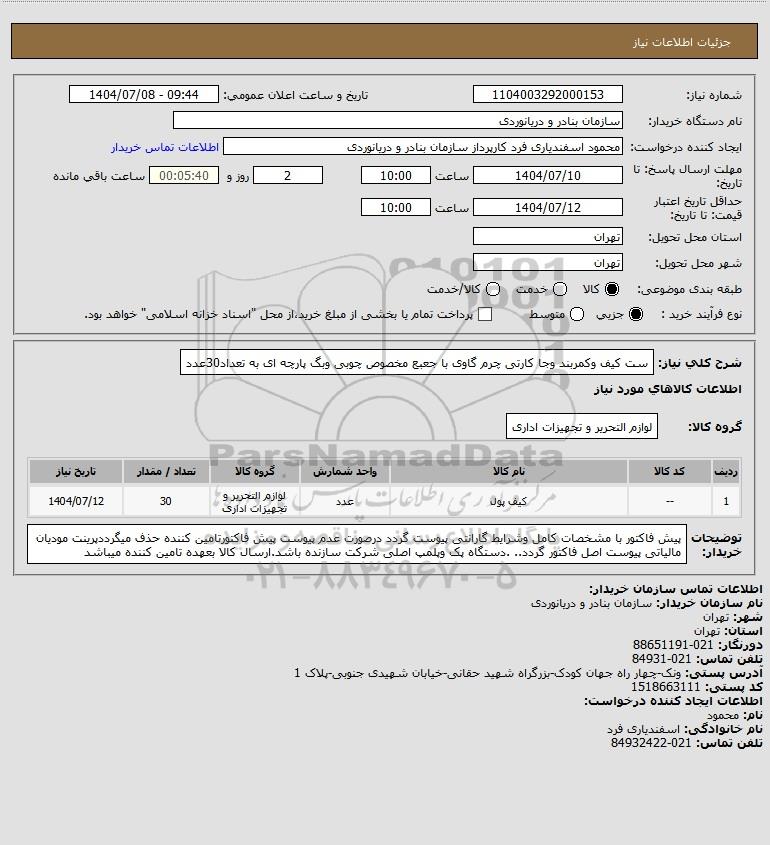 استعلام بها و موضوع استعلام استعلام ست کیف وکمربند وجا کارتی چرم گاوی با جعبع مخصوص چوبی وبگ پارچه ای به تعداد30عدد به اطلاع کلیه شرکت‌ها و افراد متخصص واجد شرایط می‌رساند، آگهی گذار در نظر دارد از طریق استعلام بها، نسبت به انتخاب و دریافت پیشنهادات اقدام نماید. این استعلام با کد آگهی ثبت شده در سامانه خبرگزاری پارس نماد : 9622341 منتشر شده است. مشخصات استعلام : تاریخ شروع استعلام: 1404/07/08 آخرین مهلت ارسال پیشنهاد قیمت : 1404/07/10 و محل اجرای پروژه : استان تهران میباشد. استعلام قیمت مورد درخواست : استعلام ست کیف وکمربند وجا کارتی چرم گاوی با جعبع مخصوص چوبی وبگ پارچه ای به تعداد30عدد با دسته‌بندی‌های تخصصی و گروه های مرتبط : البسه و پوشاک, نخ و پارچه, استعلام اطلاع رسانی میگردد.