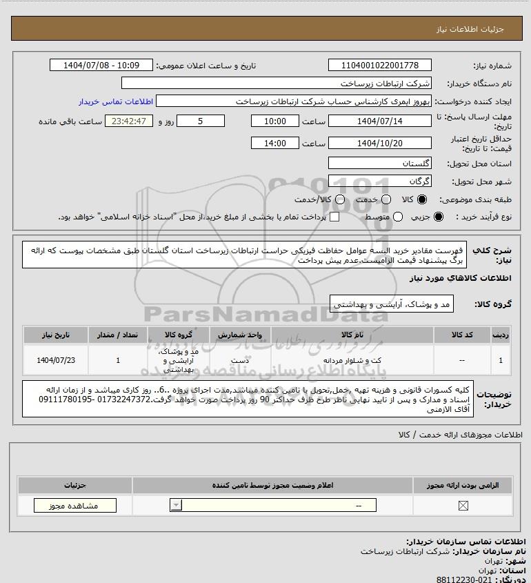 شرح کلی نیاز: فهرست مقادیر خرید البسه عوامل حفاظت فیزیکی حراست ارتباطات زیرساخت استان گلستان طبق مشخصات پیوست که ارائه برگ پیشنهاد قیمت الزامیست.عدم پیش پرداخت