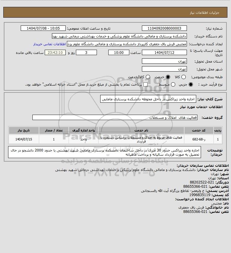 توضیحات خریدار:اجاره واحد زیراکس حدود 30 متری در داخل ساختمان دانشکده پرستاری مامایی شهید بهشتی با حدود 2000 دانشجو در حال تحصیل به صورت قرارداد سالیانه و پرداخت ماهیانه