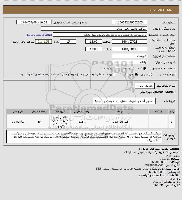 | 1 | -- | ملزومات مخزن | عدد | ماشین آلات و ملزومات حمل، بسته بندی و نگهداری | 50 | 1404/08/07 |