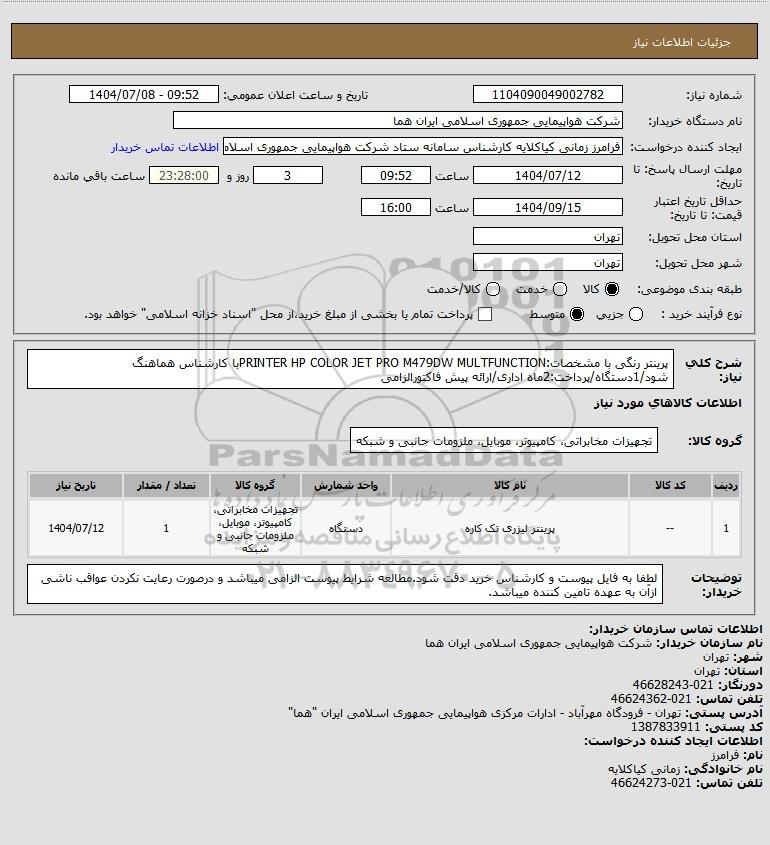 شرح کلی نیاز: پرینتر رنگی با مشخصات:PRINTER HP COLOR JET PRO M479DW MULTFUNCTIONبا کارشناس هماهنگ شود/1دستگاه/پرداخت:2ماه اداری/ارائه پیش فاکتورالزامی