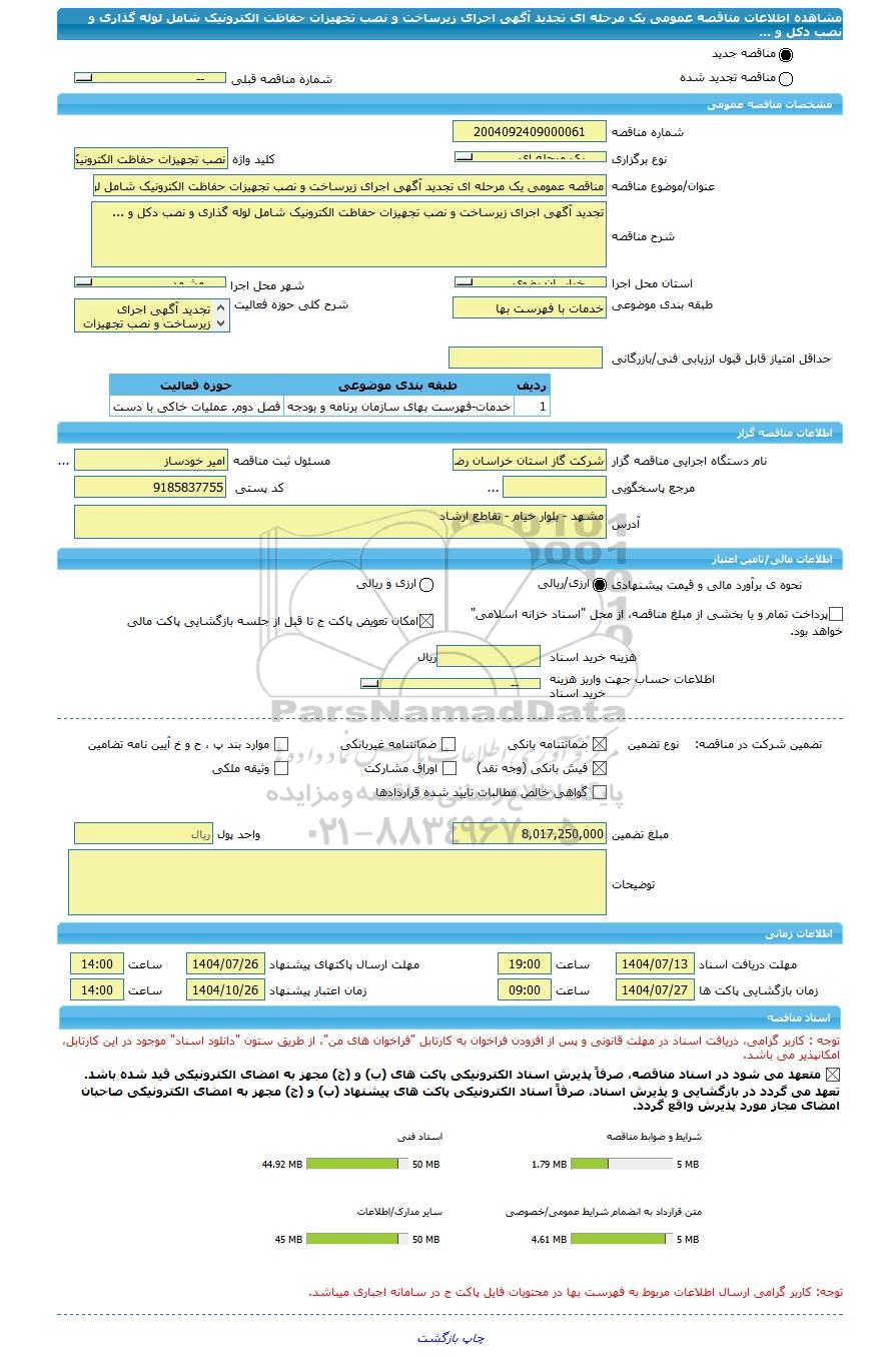 عنوان/موضوع مناقصهمناقصه عمومی یک مرحله ای تجدید آگهی اجرای زیرساخت و نصب تجهیزات حفاظت الکترونیک شامل لوله گذاری و نصب دکل و ...