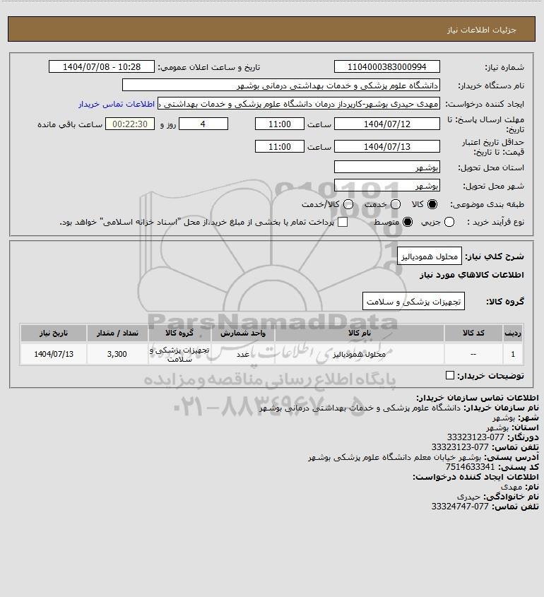 | 1 | -- | محلول همودیالیز | عدد | تجهیزات پزشکی و سلامت | 3,300 | 1404/07/13 |