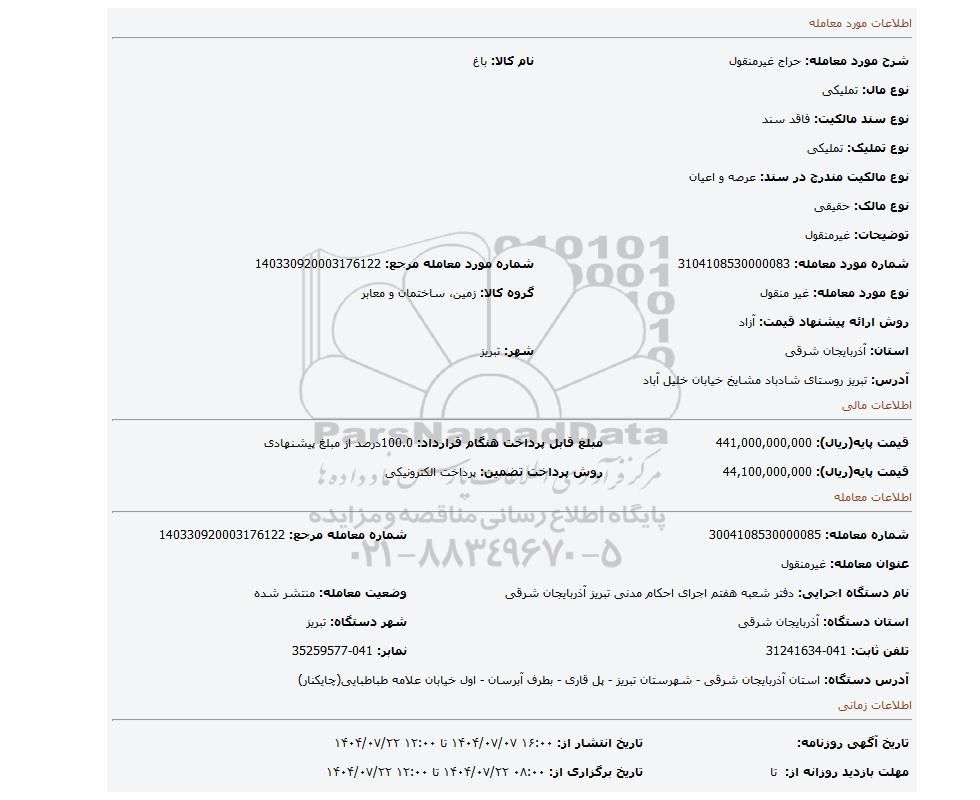 شرح مورد معامله: حراج غیرمنقولنام کالا: باغ
