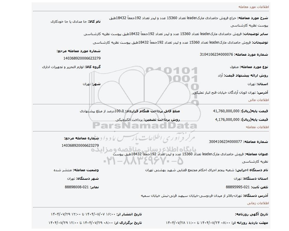 مزایده، فروش جامدادی مارکleader تعداد 15360 عدد  و لیدر تعداد 192جمعآ  18432طبق پیوست  نظریه کارشناسی