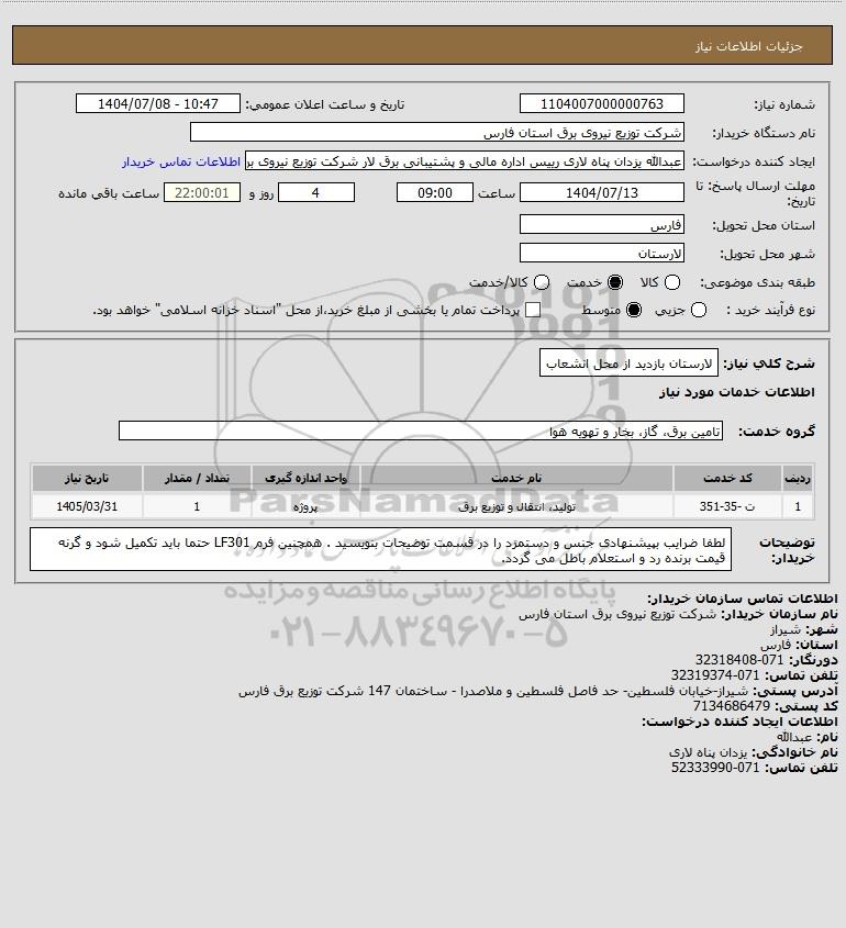 شرح کلی نیاز: لارستان بازدید از محل انشعاب