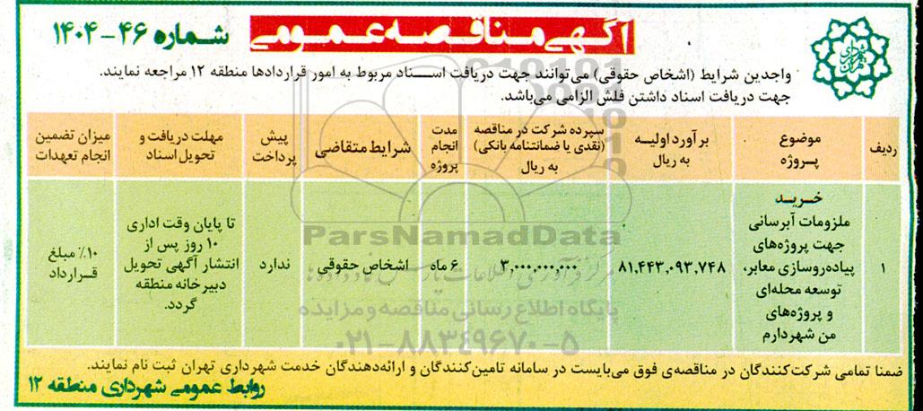 مناقصه خرید ملزومات آبرسانی جهت پروژه های پیاده روسازی معابر، توسعه محله ای و پروژه های من شهردارم ؟