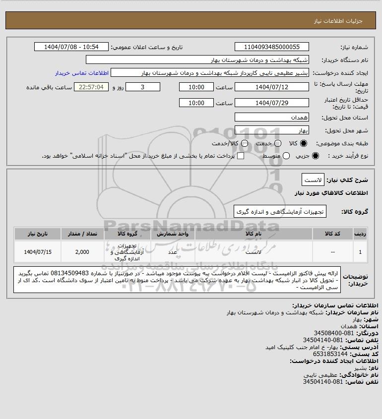 استعلام بها و موضوع استعلام استعلام لانست به اطلاع کلیه شرکت‌ها و افراد متخصص واجد شرایط می‌رساند، آگهی گذار در نظر دارد از طریق استعلام بها، نسبت به انتخاب و دریافت پیشنهادات اقدام نماید. این استعلام با کد آگهی ثبت شده در سامانه خبرگزاری پارس نماد : 9623326 منتشر شده است. مشخصات استعلام : تاریخ شروع استعلام: 1404/07/08 آخرین مهلت ارسال پیشنهاد قیمت : 1404/07/12 و محل اجرای پروژه : استان همدان میباشد. استعلام قیمت مورد درخواست : استعلام لانست با دسته‌بندی‌های تخصصی و گروه های مرتبط : خدمات و تجهیزات آزمایشگاهی و پزشکی, استعلام اطلاع رسانی میگردد. شرایط شرکت در استعلام آنلاین : ابتدا ثبت نام در سامانه استعلام پارس نماد و تکمیل مدارک موردنیاز و بارگذاری در سامانه رعایت تمامی ضوابط و الزامات مندرج در اسناد استعلام است.