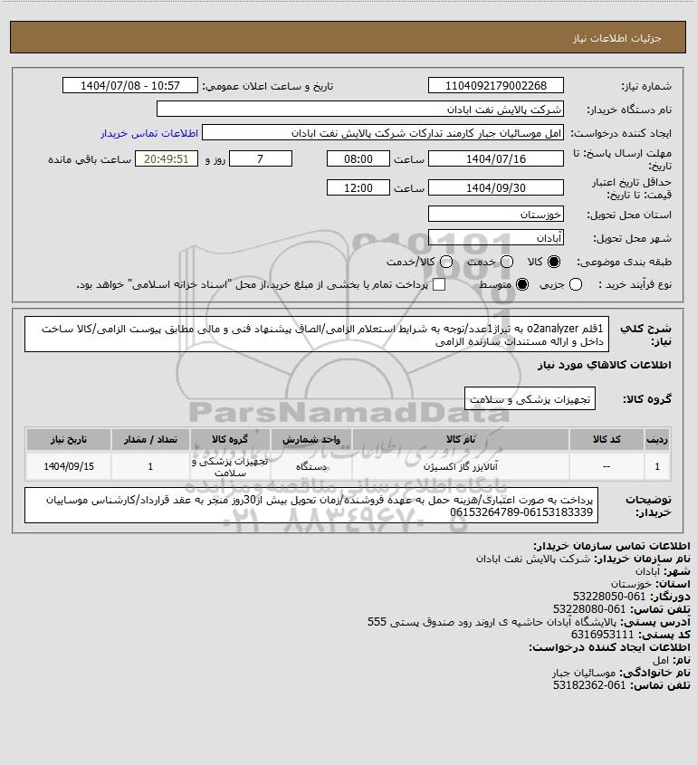 شرح کلی نیاز: 1قلم o2analyzer به تیراژ1عدد/توجه به شرایط استعلام الزامی/الصاق پیشنهاد فنی و مالی مطابق پیوست الزامی/کالا ساخت داخل و ارائه مستندات سازنده الزامی