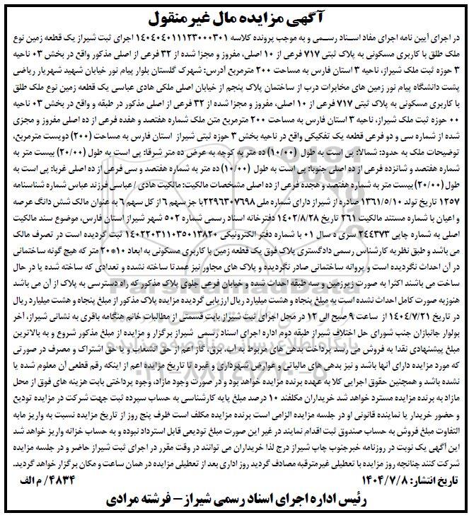 در اجرای آیین نامه اجرای مفاد اسناد رسمی و به موجب پرونده کلاسه 140404011123000301 اجرای ثبت شیر از یک قطعه زمین نوع ملک طلق با کاربری مسکونی به پلاک ثبتی 717 فرعی از 10 اصلی مفروز و مجزا شده از 32 فرعی از اصلی مذکور واقع در بخش 03 ناحیه 3 حوزه ثبت ملك شيراز - ناحيه 3 استان فارس به مساحت 200 متر مربع آدرس : شهرک گلستان بلوار پیام نور خیابان شهید شهریار ریاضی پشت دانشگاه پیام نور زمینهای مخابرات درب از ساختمان پلاک پنجم از خیابان اصلی ملكى هادی عباسی یک قطعه زمین نوع ملک طلق با کاربری مسکونی به پلاک ثبتی 717 فرعی از 10 اصلی ، مفروز و مجزا شده از 32 فرعی از اصلی مذکور در طبقه و واقع در بخش 03 ناحيه 00 حوزه ثبت ملک شيراز - ناحيه 3 استان فارس به مساحت 200 متر مربع متن ملک شماره هفتصد و هفده فرعي از ده اصلی مفروز و مجزی شده از شماره سی و دو فرعي قطعه یک تفکیکی واقع در ناحيه بخش 3 حوزه ثبتی شیراز استان فارس به مساحت (200) دویست متر مربع، توضیحات ملک به حدود شمالا پی است بطول 00 / 10، ده متر به کوچه به عرض ده متر شرقا پی است بطول 00 / 20) بیست متر به شماره هفتصد و شانزده فرعی از ده اصلي جنوبا پی است بطول 00 / 10) ده متر به شماره هفتصد وسی فرعی از ده اصلی غربا پی است بطول (00 / 20 بیست متر به شماره هفتصد و هجده فرعی از ده اصلی مشخصات مالكيت: مالكيت هادي /عباسی فرزند عباس شماره شناسنامه 1257 تاریخ تولد 1361/05/10 صادره از شیراز دارای شماره ملی 2296307698 با جز سهم 6 از کل سهم 6 بعنوان مالک شش دانگ عرصه و اعیان با شماره مستند مالکیت باجر 261 تاریخ 1402/08/28 دفترخانه اسناد رسمی شماره 502 شهر شیراز استان فارس موضوع سند مالکیت اصلی بشماره چاپی 244373 سری ۵ سال 01 با شماره دفتر الکترونیکی 140220311035013820 ثبت گردیده است در تصرف مالک می باشد و طبق نظریه کارشناس رسمی دادگستری پلاک فوق یک قطعه زمین با کاربری مسکونی به ابعاد 10*20 متر که هیچ گونه ساختمانی در آن احداث نگردیده است و پروانه ساختمانی صادر نگردیده و پلاکهای مجاور نیز عمدتا ساخته نشده و تعدادی که ساخته شده یا در حال ساخت می باشند اکثرا به صورت زیرزمین و سه طبقه احداث شده و خیابان فرعی جلوی پلاک مذکور که راه دسترسی به پلاک از آن میباشد هنوز بصورت کامل احداث نشده است به مبلغ پنجاه و هشت میلیارد ریال ارزیابی گردیده مزایده پلاک مذکور از مبلغ پنجاه و هشت میلیارد ریال در تاریخ 1404.7.21  از ساعت 9 صبح الی 12 در محل اجرای ثبت شیراز بابت قسمتی از مطالبات خانم هنگامه باقری به نشانی شیراز آخر بلوار جانبازان جنب شورای حل اختلاف شیراز طبقه دوم اداره اجراي اسناد رسمي شیراز برگزار و مزایده از مبلغ مذکور شروع و به بالاترین مبلغ پیشنهادی نقدا به فروش می رسد پرداخت بدهي هاي مربوط به آب برق گاز اعم از حق انشعاب و یا حق اشتراك و مصرف در صورتی که مورد مزایده دارای آنها باشد و نیز بدهي هاي مالياتي و عوارض شهرداری و غیره تا تاریخ مزایده اعم از اینکه رقم قطعي آن معلوم شده یا نشده باشد و همچنین حقوق اجرایی کلا به عهده برنده مزایده خواهد بود و در صورت وجود مازاد وجوه پرداختی بابت هزينه هاي فوق از محل مازاد به برنده مزایده مسترد خواهد شد خریداران مکلفند 10 درصد مبلغ پایه کارشناسی به حساب سپرده ثبت جهت شرکت در مزایده تودیع و حضور خریدار یا نماینده قانونی او در جلسه مزایده الزامی است برنده مزایده مکلف است ظرف پنج روز از تاریخ مزایده نسبت به واریز مابه التفاوت مبلغ فروش به حساب صندوق ثبت اقدام نمایند در غیر اینصورت مبلغ تودیعی قابل استرداد نبوده و به حساب خزانه واریز خواهد شد این آگهی یک نوبت در روزنامه خبر جنوب