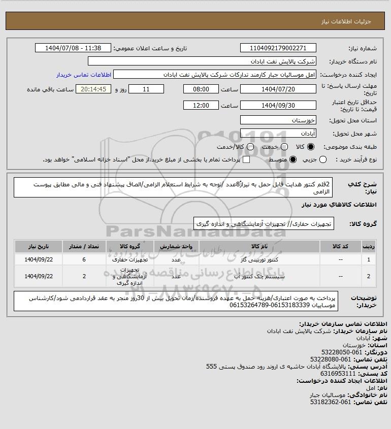 | 1 | -- | کنتور توربینی گاز | عدد | تجهیزات حفاری | 6 | 1404/09/22 |