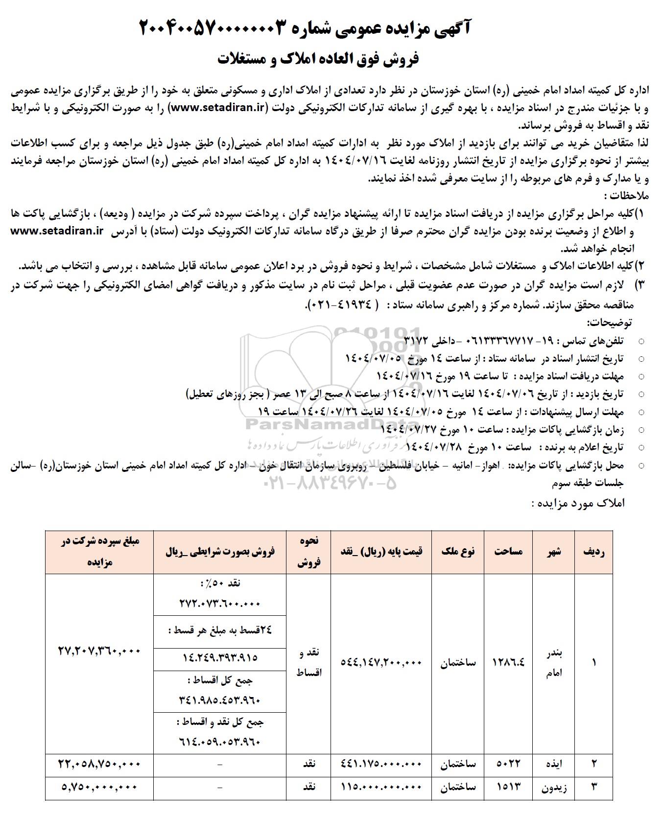 اداره کل کمیته امداد امام خمینی (ره) استان خوزستان در نظر دارد تعدادی از املاک اداری و مسکونی متعلق به خود را از طریق برگزاری مزایده عمومی و با جزئیات مندرج در اسناد مزایده ، با بهره گیری از سامانه تدارکات الکترونیکی دولت (سایت ستاد ایران) را به صورت الکترونیکی و با شرایط نقد و اقساط به فروش برساند.