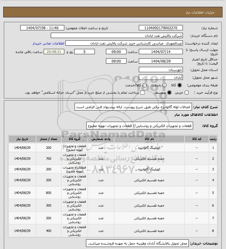 | 7 | -- | جعبه تقسیم الکتریکی | عدد | قطعات و تجهیزات الکتریکی و روشنایی | 200 | 1404/08/29 |