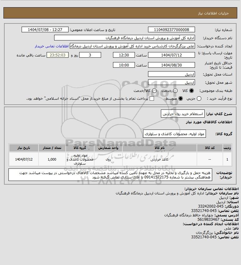 | 1 | -- | کاغذ حرارتی | رول | مواد اولیه، محصولات کاغذی و سلولزی | 1,000 | 1404/07/12 |