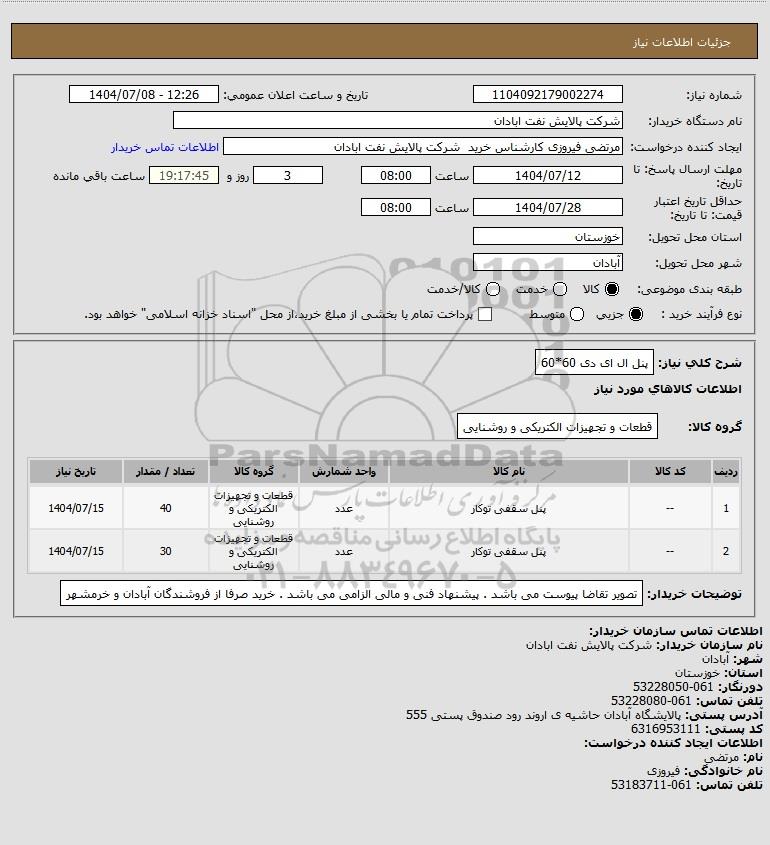 | 2 | -- | پنل سقفی توکار | عدد | قطعات و تجهیزات الکتریکی و روشنایی | 30 | 1404/07/15 |