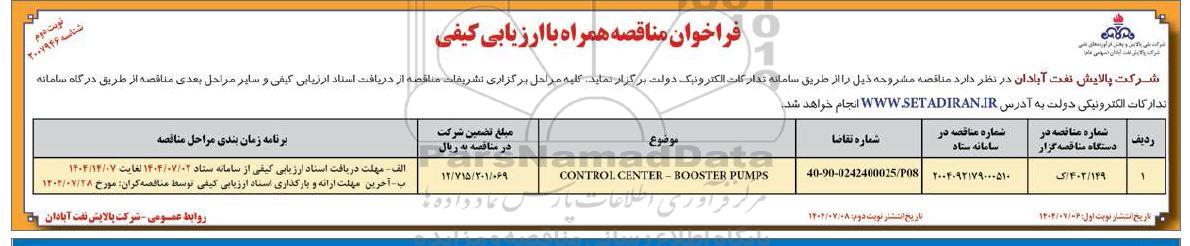 مناقصه CONTROL CENTER -BOOSTER PUMPS  نوبت دوم , مناقصه CONTROL CENTER -BOOSTER PUMPS  نوبت دوم