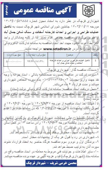 شهرداری قرچک در نظر دارد به استناد مجوز 1403/1/52555 مورخه 1403/11/17 جانشین شورای اسلامی شهر قرچک نسبت به تکمیل عملیات طراحی و اجرایی و احداث کارخانه آسفالت و سنگ شکن جمال آباد از طریق برگزاری مناقصه عمومی اقدام نماید لذا از کلیه پیمانکاران واجد الشرايط دعوت میشود جهت اخذ اسناد مناقصه به سامانه تدارکات الکترونیکی دولت (ستاد) ایران مراجعه نمایند.
