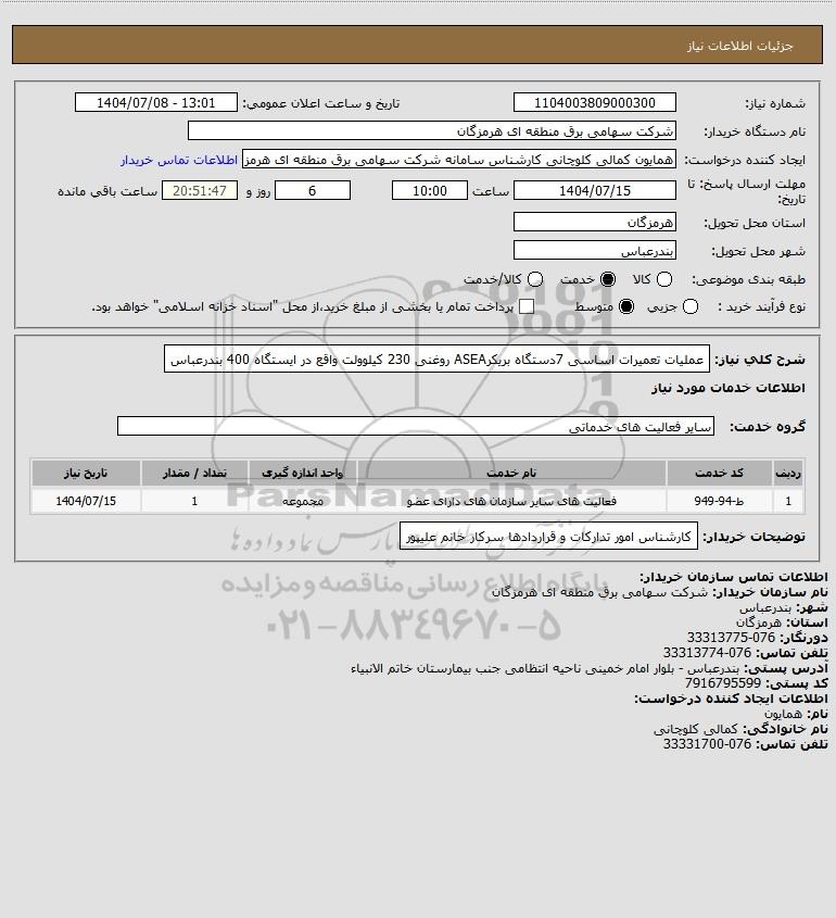 شرح کلی نیاز: عملیات تعمیرات اساسی 7دستگاه بریکرASEA روغنی 230 کیلوولت واقع در ایستگاه 400 بندرعباس