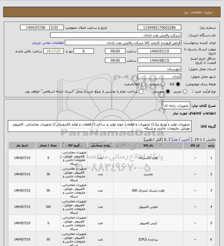 | 1 | -- | هارد اکسترنال | عدد | تجهیزات مخابراتی، کامپیوتر، موبایل، ملزومات جانبی و شبکه | 5 | 1404/07/15 |