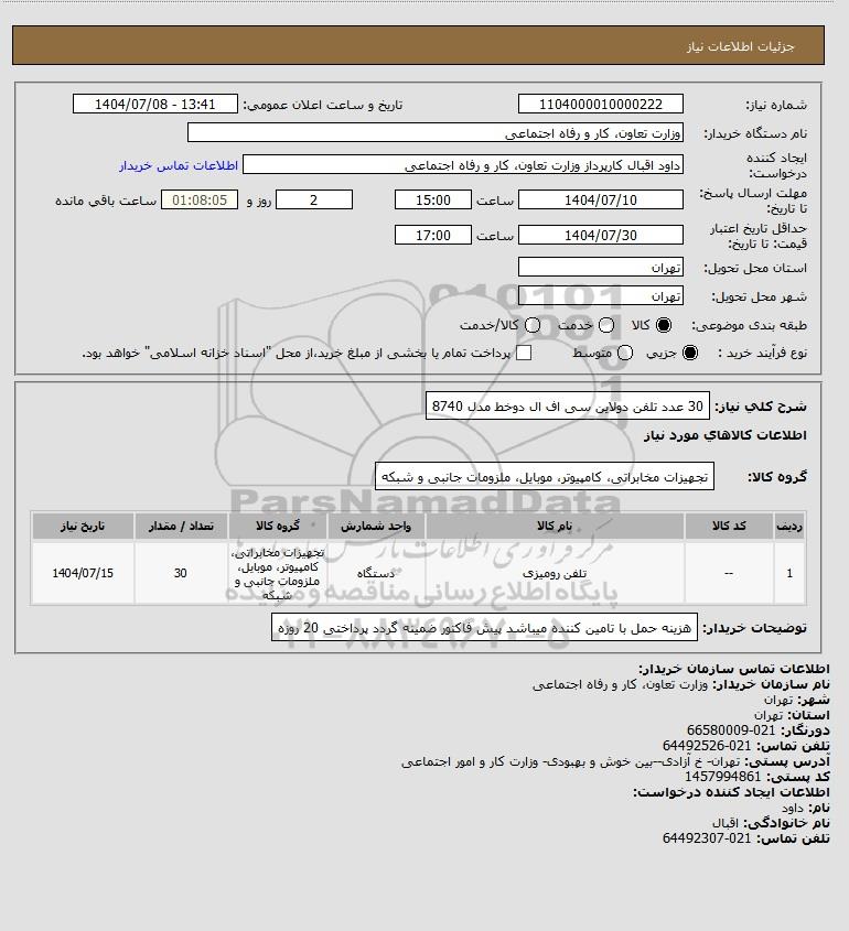 | 1 | -- | تلفن رومیزی | دستگاه | تجهیزات مخابراتی، کامپیوتر، موبایل، ملزومات جانبی و شبکه | 30 | 1404/07/15 |