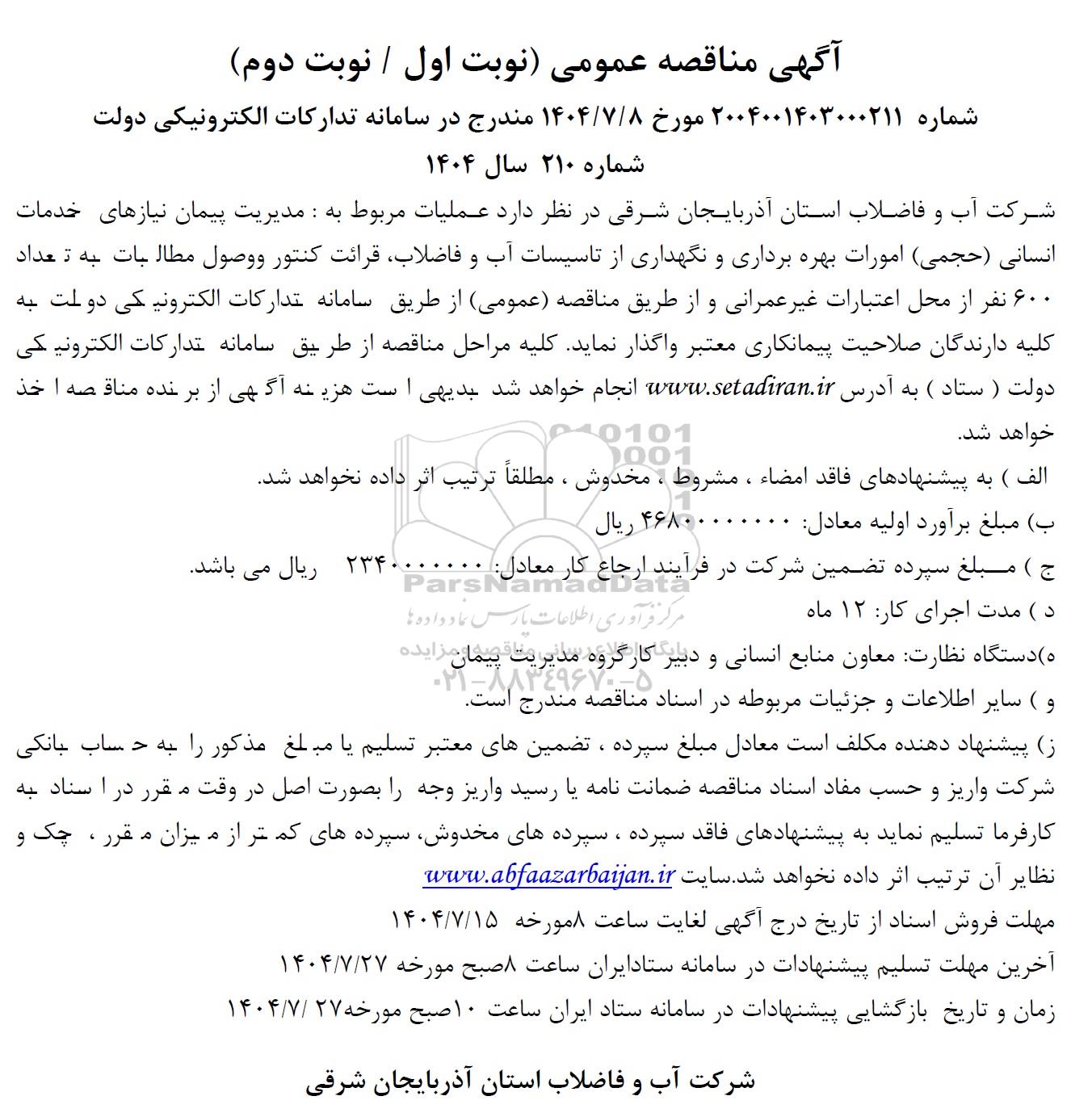 شرکت آب و فاضلاب استان آذربایجان شرقی در نظر دارد عملیات مربوط به مدیریت پیمان نیازهای خدمات انسانی حجمی امورات بهره برداری و نگهداری از تاسیسات آب و فاضلاب قرائت کنتور ووصول مطالبات به تعداد 600 نفر از محل اعتبارات غیر عمرانی و از طریق مناقصه (عمومی) از طریق سامانه تدارکات الکترونیکی دولت به کلیه دارندگان صلاحیت پیمانکاری معتبر واگذار نماید کلیه مراحل مناقصه از طریق سامانه تدارکات الکترونیکی دولت ( ستاد ) به آدرس ستاد ایران انجام خواهد شد بدیهی است هزینه آگهی از برنده مناقصه ا خذ خواهد شد.