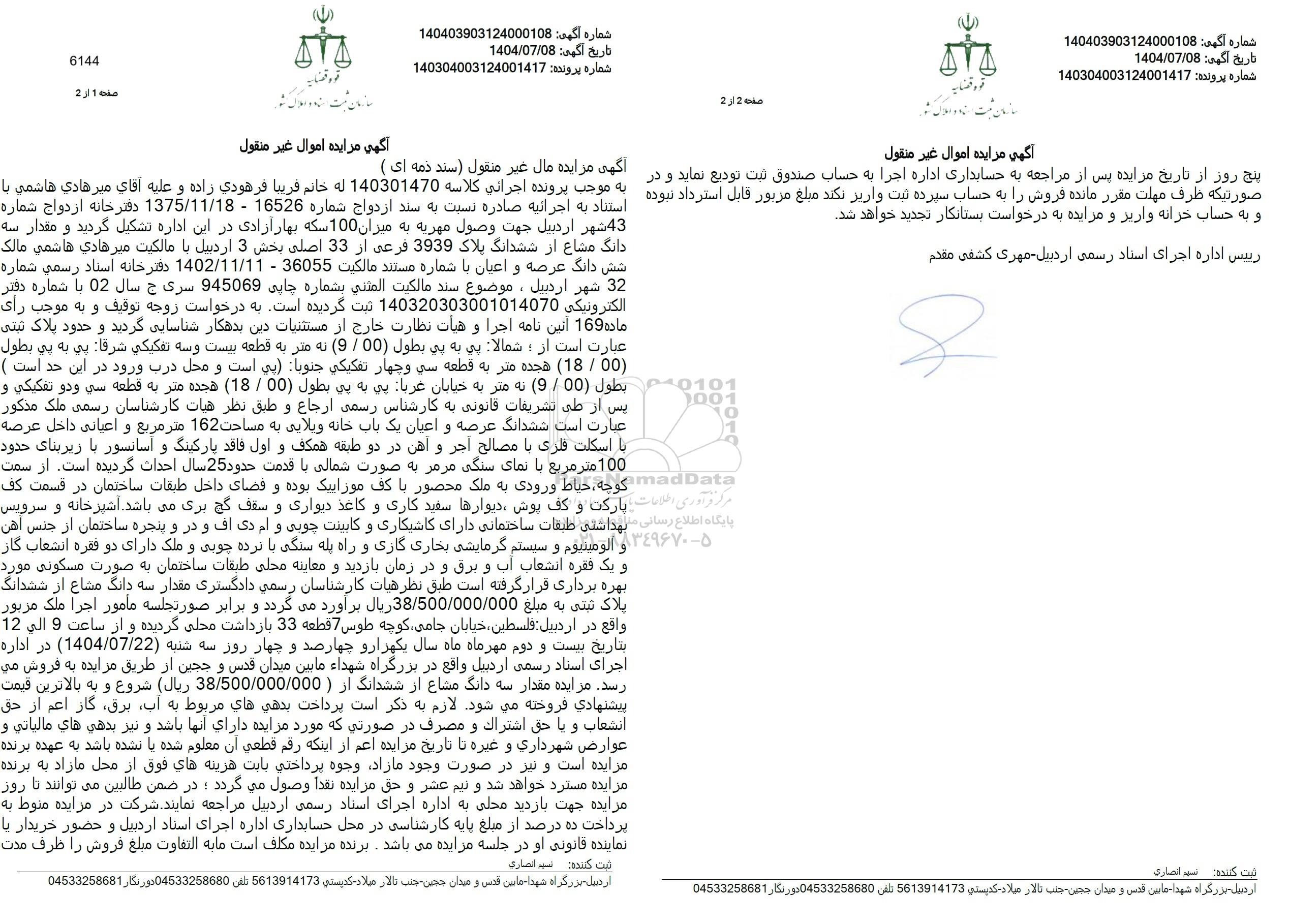 1 مزایده فروش تعدادی از املاک 9818193 1404/08/18 new special not payed سایر