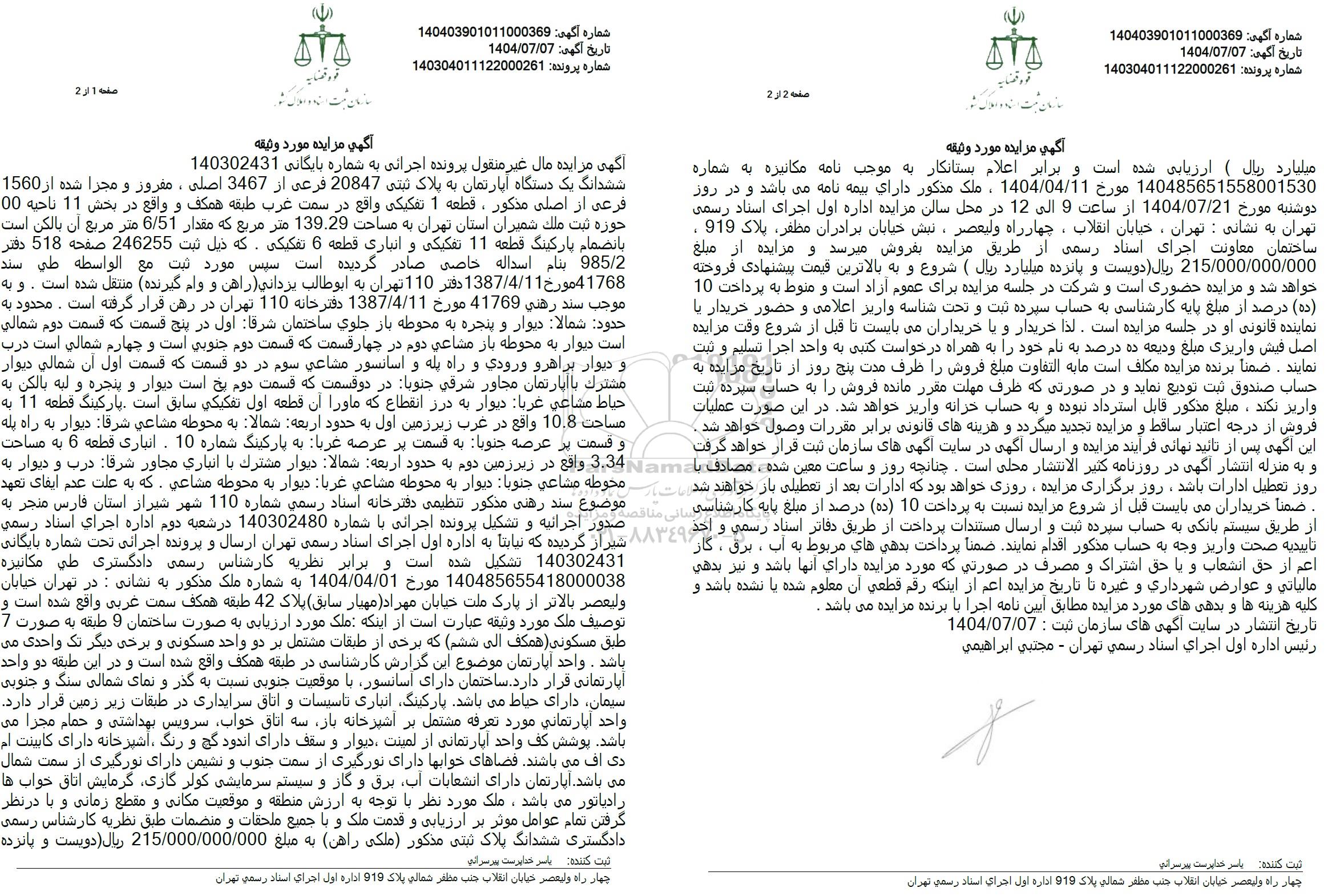 تاریخ مزایده 1404.07.21 ساعت 9 الی 12 روز دوشنبه در محل سالن مزایده اداره اول اجرای اسناد رسمی تهران به نشانی تهران، خیابان انقلاب، چهارراه ولیعصر، نبش خیابان براردان مظفر، پلاک 919