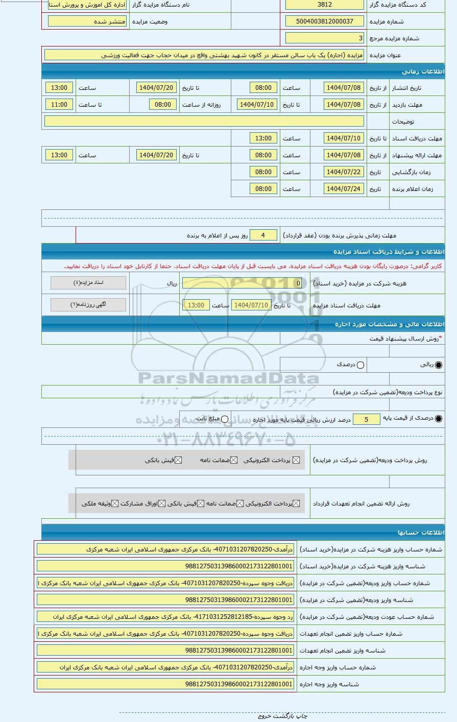 | شماره مورد اجاره | 5104003812000040 | نوع برگزاری مزایده | مزایده عمومی | |