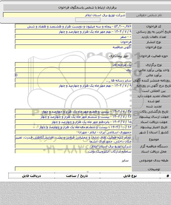 مناقصه انجام کلیه فعالیت های اداری و عملیاتی فروش و نصب افزایش/کاهش قدرت تغییر مکان داخلی جمع آوری انشعا, مناقصه, انجام کلیه فعالیت های اداری و عملیاتی فروش و نصب، افزایش/کاهش قدرت، تغییر مکان داخلی، جمع آوری انشعا