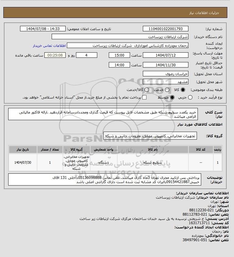 | 1 | -- | سوئیچ شبکه | دستگاه | تجهیزات مخابراتی، کامپیوتر، موبایل، ملزومات جانبی و شبکه | 1 | 1404/07/30 |