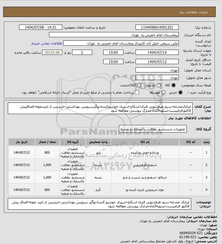 شرح کلی نیاز: ایرانکدمشابه-سیم ظرفشویی فنری-اسکاج-اسپری خوشبوکننده-بوگیرسرویس بهداشتی-خریدپس از تاییدنمونه-الصاقپیش فاکتورالزامیست-تسویه3ماه-مدارک پیوستی مطالعه شود