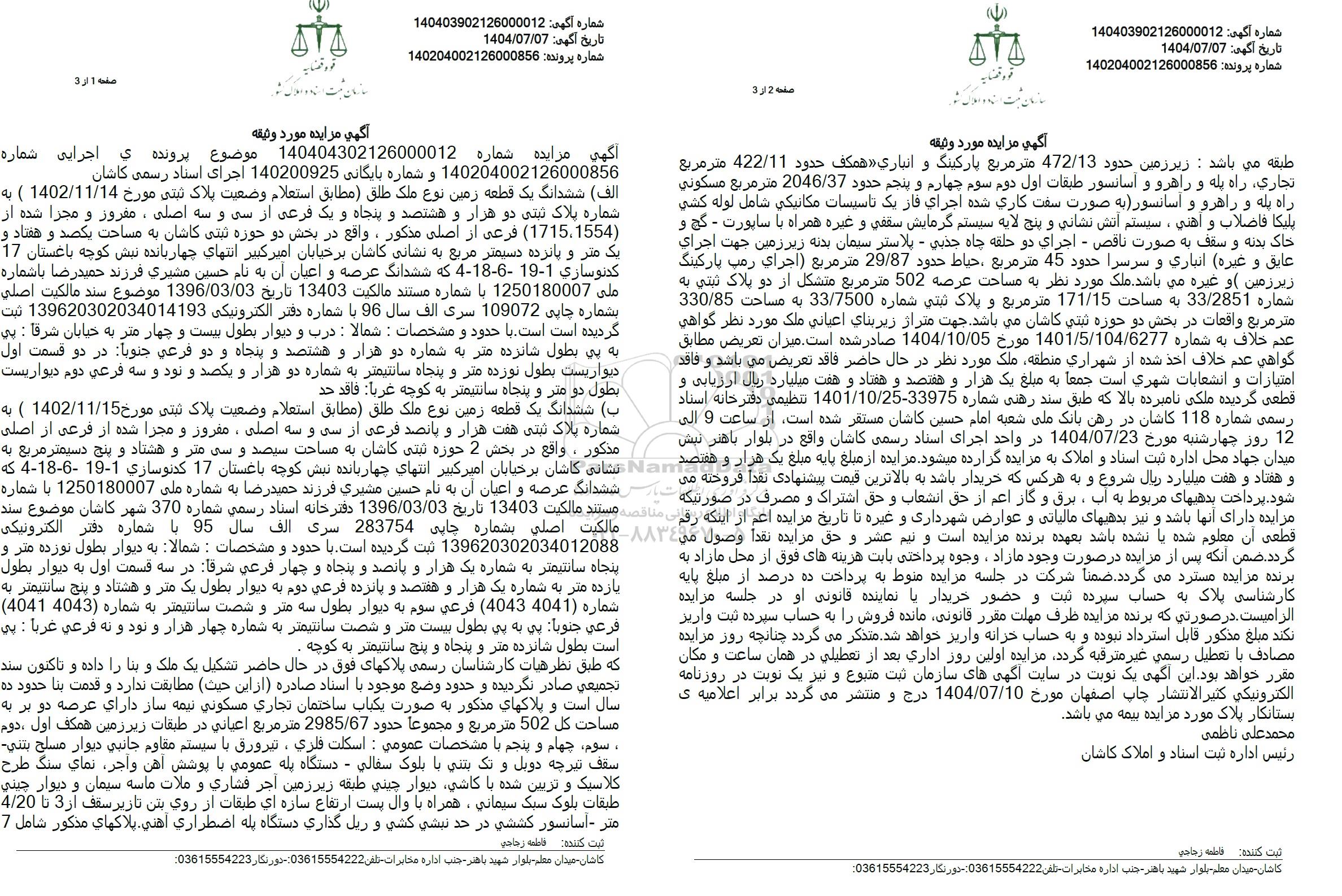 مزایده فروش یک قطعه زمین به مساحت یکصد و هفتاد و یک متر و پانزده دسیمترمربع پلاک ثبتی 1715، 1554 فرعی از اصلی مذکور واقع در کاشان، بر خیابان امیرکبیر، انتهای چهاربانده نبش کوچه باغستان 17