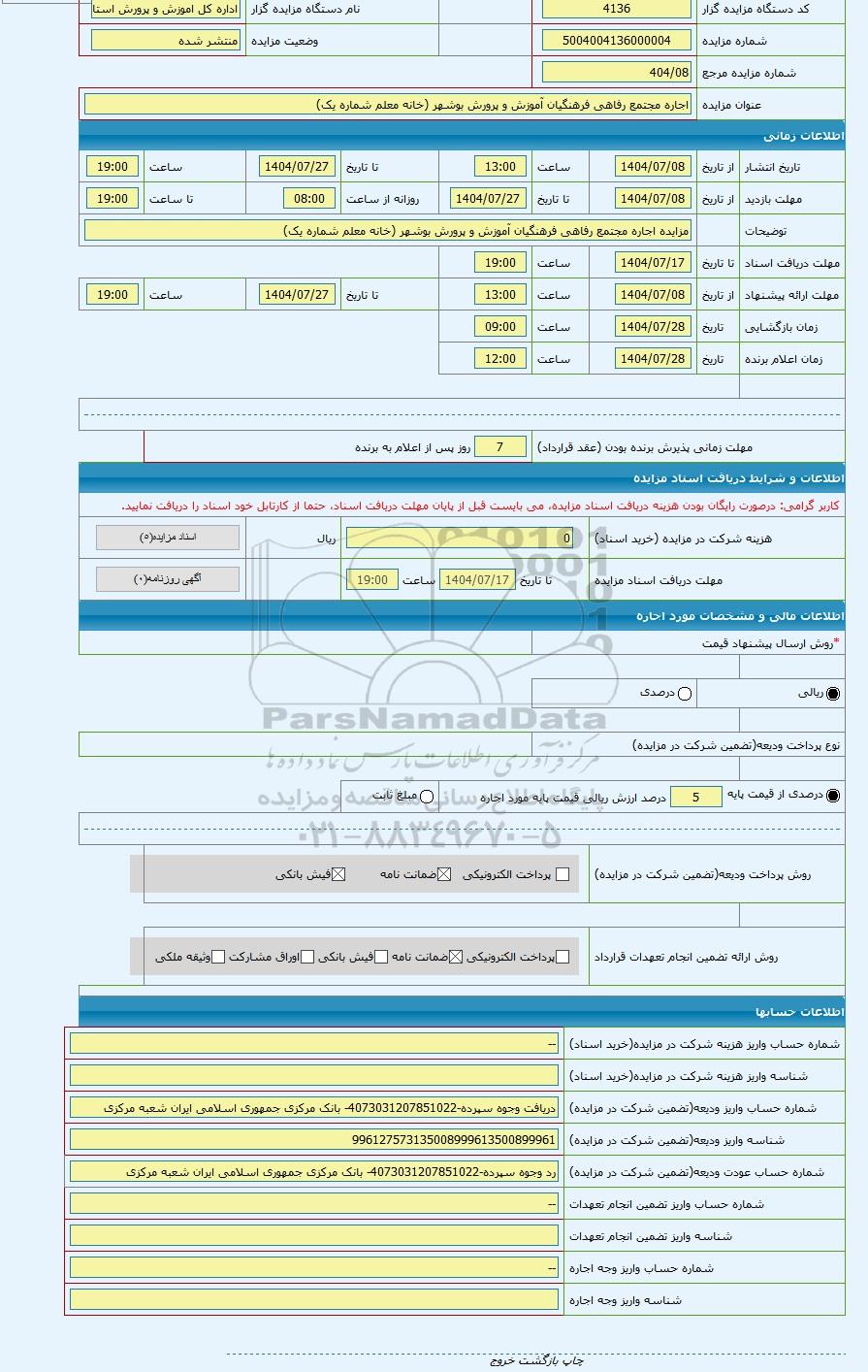 | کد مزایده گزار | 4136 | نام دستگاه مزایده گزار | اداره کل اموزش و پرورش استان بوشهر | |