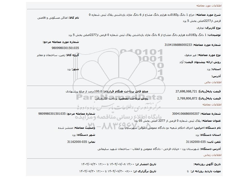 مزایده 1 دانگ و0183ده هزارم دانگ مشاع از 6 دانگ مازاد بازداشتی پلاک ثبتی شماره 0 فرعی از2277اصلی بخش 5 یزد, مزایده، 1 دانگ و0183ده هزارم دانگ مشاع از 6 دانگ مازاد بازداشتی پلاک ثبتی شماره 0 فرعی از2277اصلی بخش 5 یزد