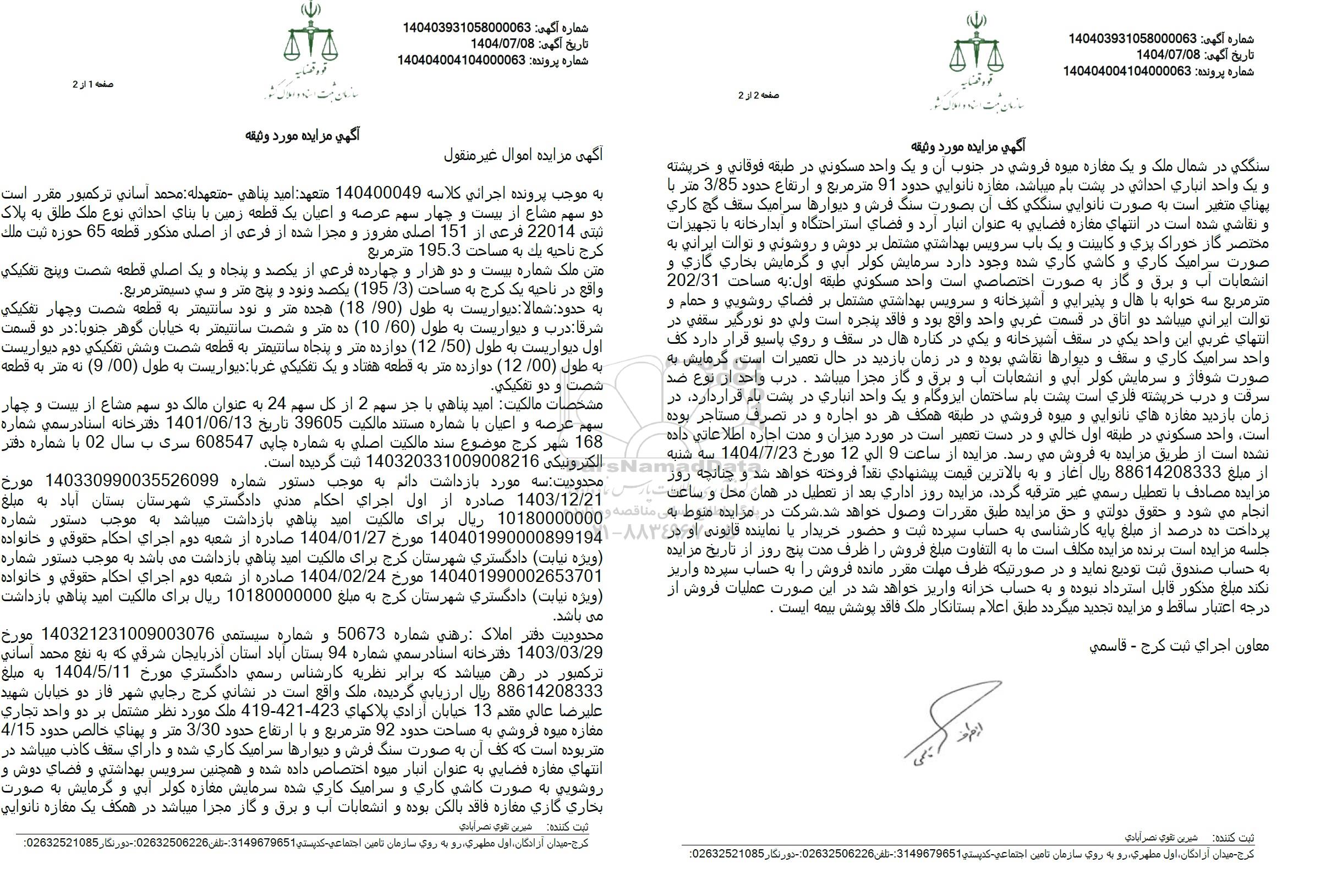 به موجب پرونده اجرائی کلاسه 140400049 متعهد: امید پناهی متعهدله محمد اسانی ترکمبور مقرر است.دو سهم مشاع از بیست و چهار سهم عرصه و اعیان یک قطعه زمین با بنای احداثی نوع ملک طلق به پلاک ثبتی 22014 فرعی از 151 اصلی مفروز و مجرا شده از فرعی از اصلی مذکور قطعه 65 حوزه ثبت ملك کرج ناحیه یک به مساحت 195.3 متر مربع متن ملک شماره بیست و دو هزار و چهارده فرعی از یکصد و پنجاه و یک اصلی قطعه شصت وينج تفكيكي واقع در ناحیه یک کرج به مساحت (1953) يکصد و نود و پنج متر و سی دسیمتر مربع.