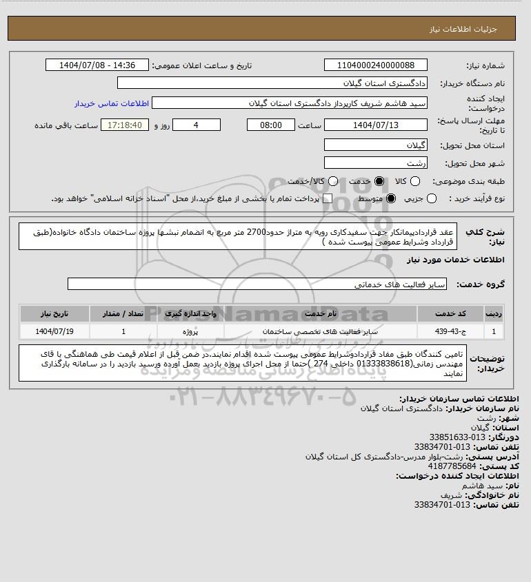 شرح کلی نیاز: عقد قراردادپیمانکار جهت سفیدکاری رویه به متراژ حدود2700 متر مربع به انضمام نبشها پروژه ساختمان دادگاه خانواده(طبق قرارداد وشرایط عمومی پیوست شده )